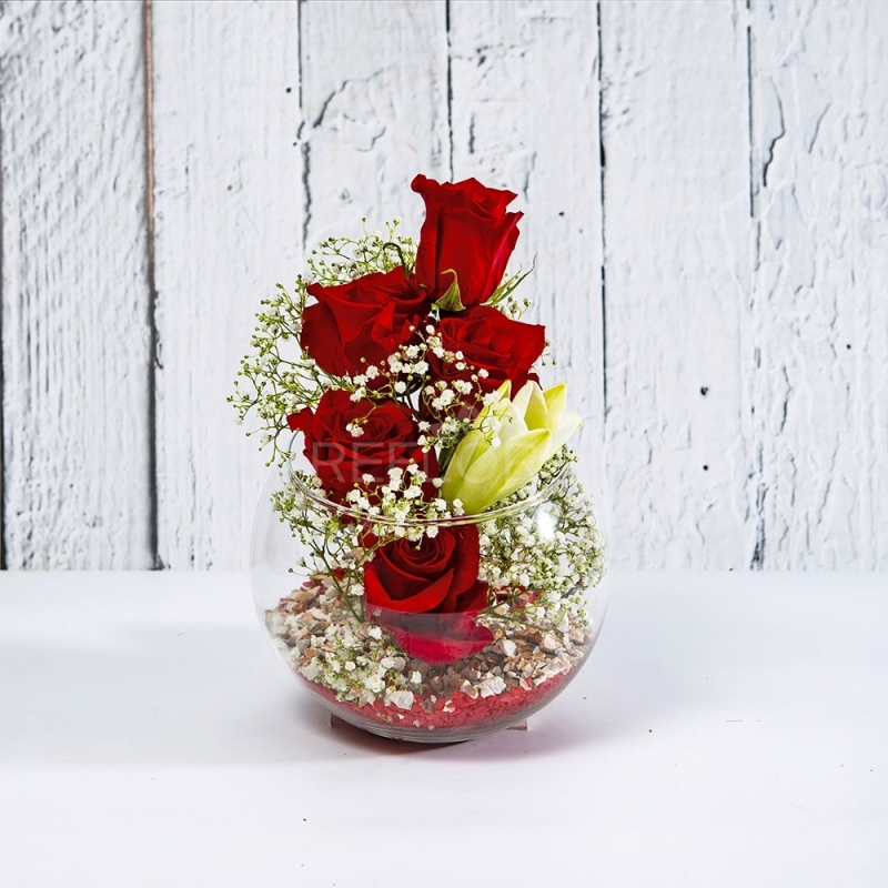 Un'idea originale in questa splendida boccia in vetro resa speciale dalla composizione di splendidi fiori e ricercati dettagli.