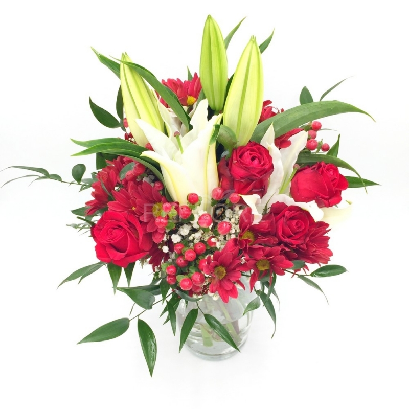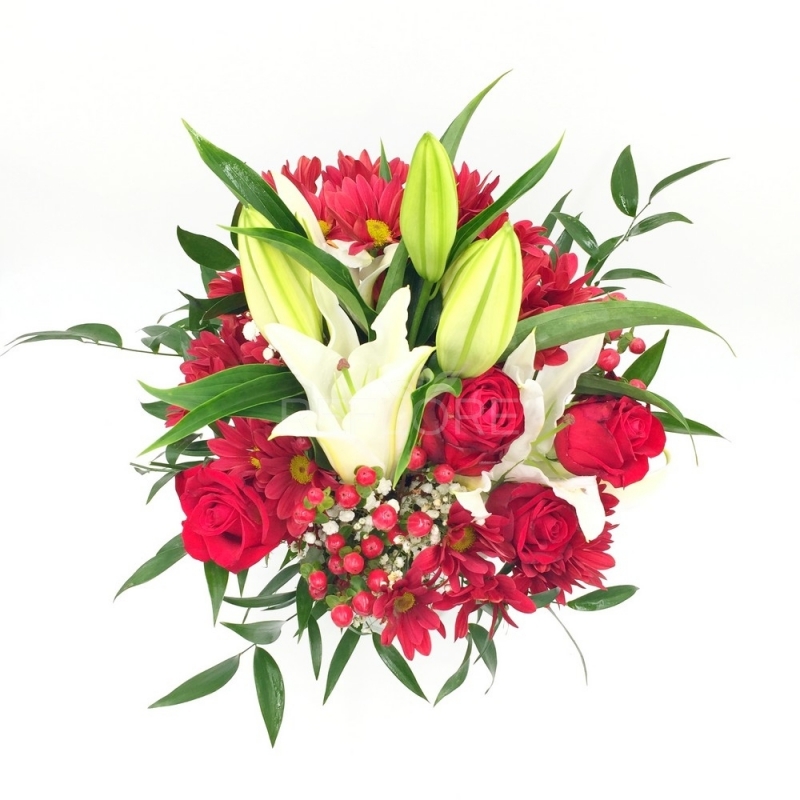 Caldo e passionale questo bouquet sarà apprezzato per la sua eleganza e la sua armonia di fiori che alterano diverse sfumature del rosso sapientemente abbinato al candore del lilium bianco. Un mix esplosivo che lo rende unico!