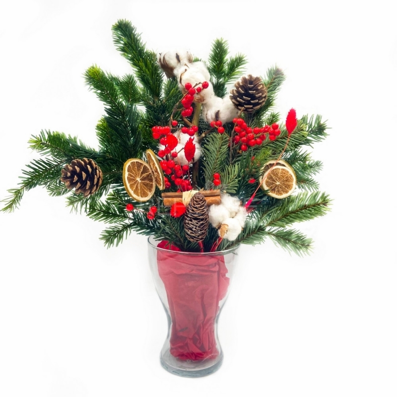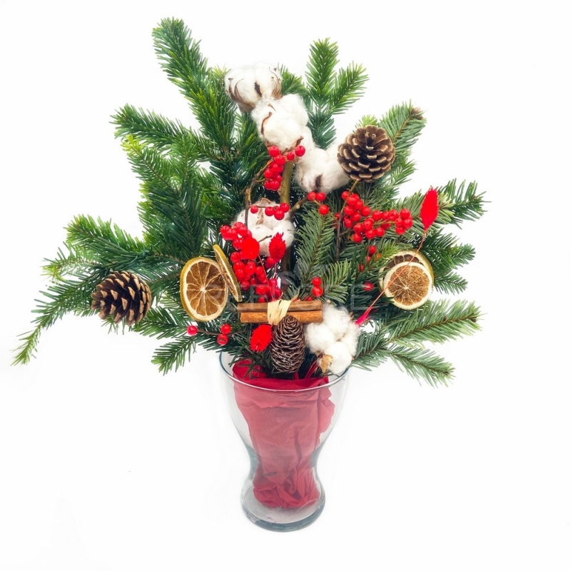 Un bouquet di lunga durata grazie all'abbinamento di profumati rami di Pino Nobilis e diverse decorazioni: dai preziosi rami di bacche, al candido cotone oppure le deliziose pigne insieme a spicchi di arance e cannella. Adatto a questo periodo di feste natalizie, è ideale per mandare un caloroso augurio ai tuoi cari.