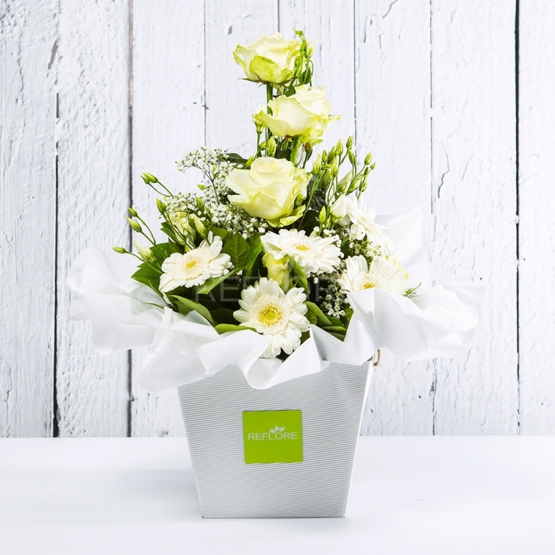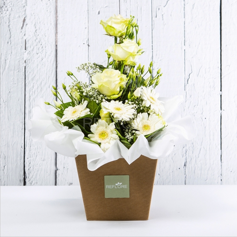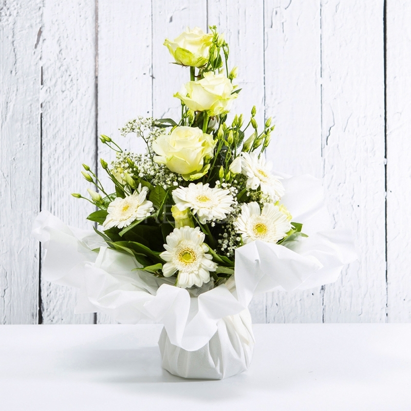 Splendido bouquet sui toni del Bianco composto da Lisianths, Rose, Gerbere e Gipsophila.