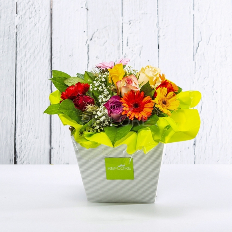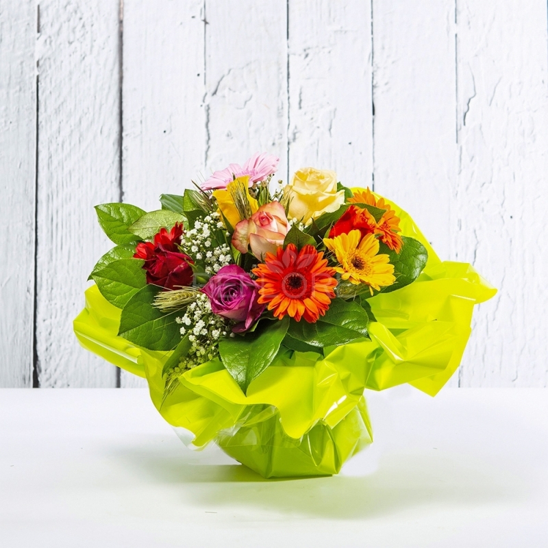 Splendido bouquet colorato composto da Rose, Gerbere, Grano e Gipsophila.