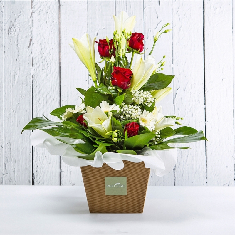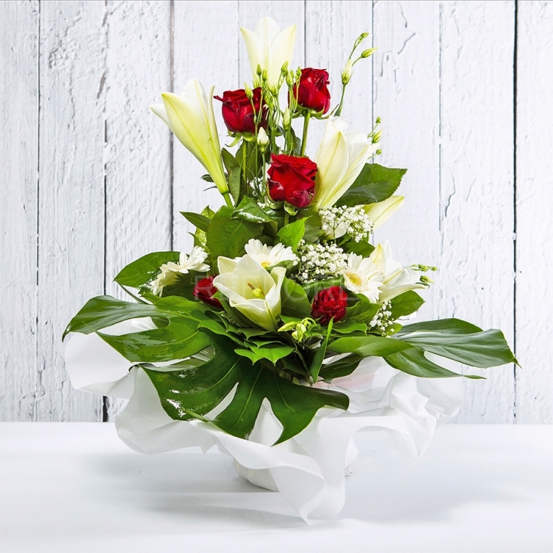 Splendido bouquet sui toni del bianco e rosso composto da Rose, Lilium, Gerbere, Lisianthus e Gipsophila.
