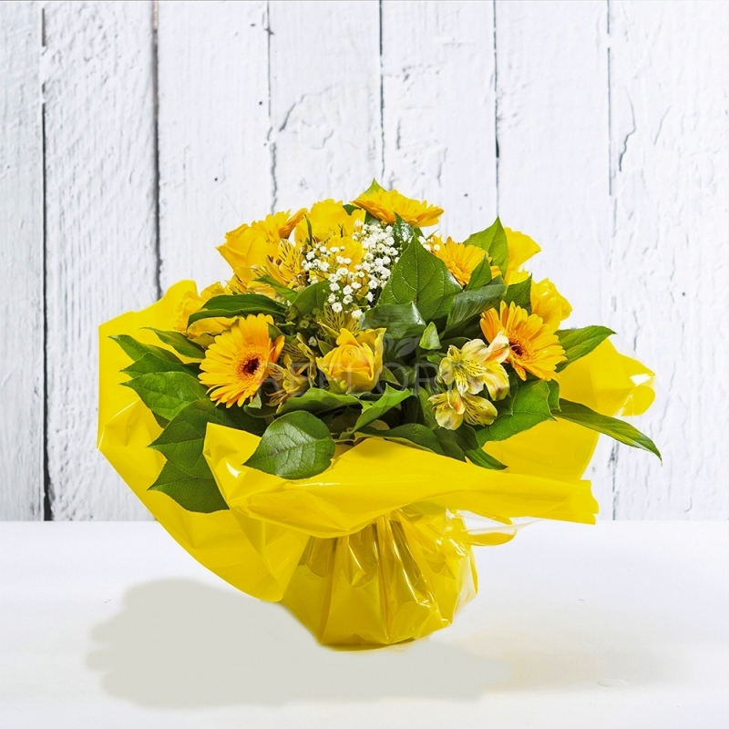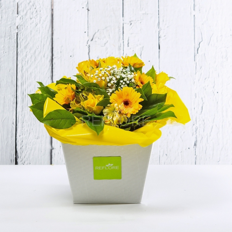 Splendido bouquet sui toni del giallo composto da Rose, Gerbere, Alstroemeria e Gipsophila.
