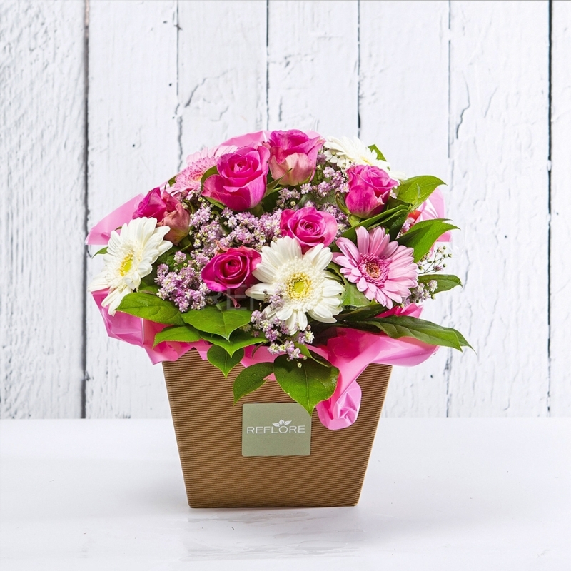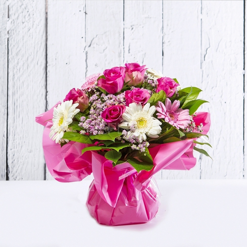 Splendido bouquet sui toni del rosa composto da Rose, Gerbere e Gipsopihila.