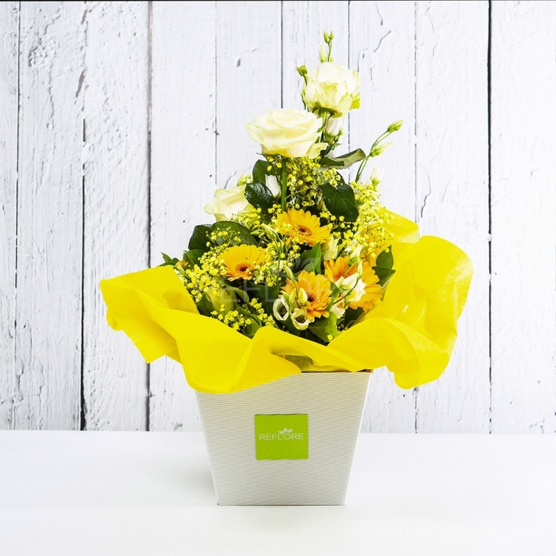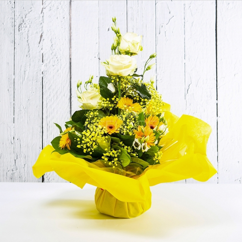 Splendido bouquet sui toni del giallo composto da Rose, Gerbere, Lisianthus e Gipsophila.