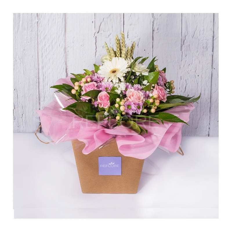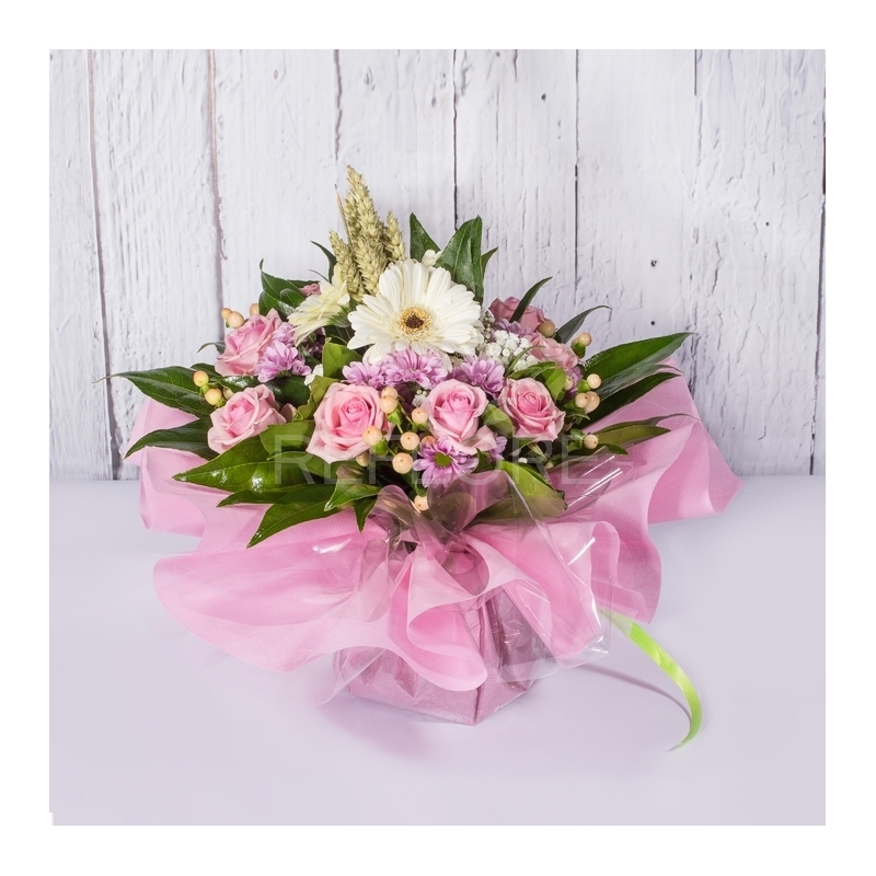 Splendido bouquet sui toni del rosa, composto da Rose, Gerbere, Margherite e Iperico.
