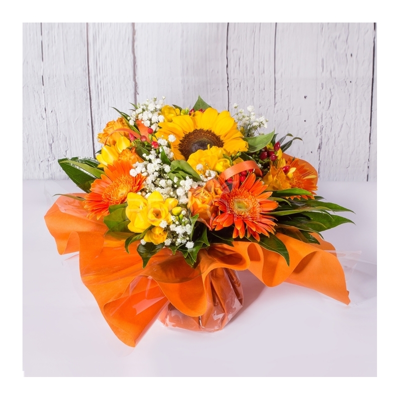 Solare bouquet sui toni dell'arancio, composto da Girasoli, Gerbere, Roselline, Fresia e Iperico.
