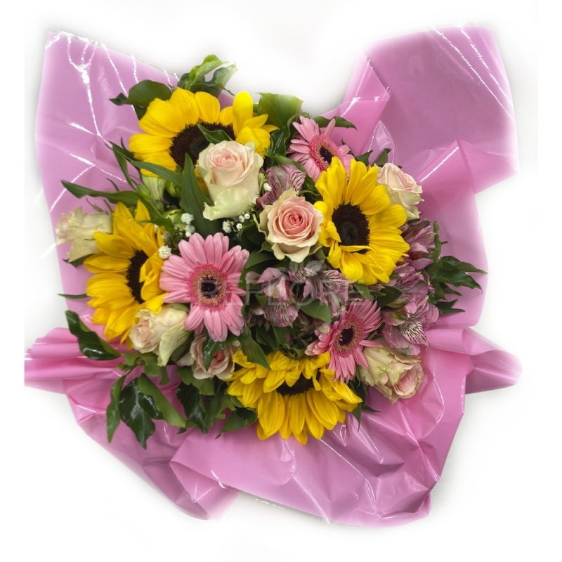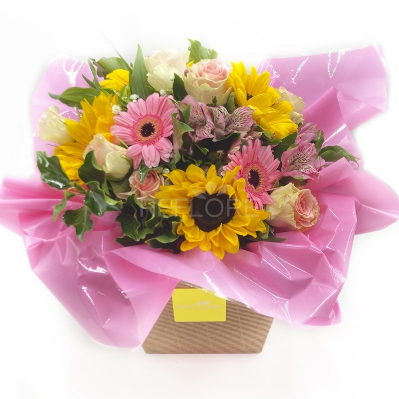 Un colorato e vivace bouquet con allegri girasoli circondati da delicate rose rosa. Ideale per portare allegria, questo bouquet ben si adatta a molteplici occasioni e ricorrenze e potrà essere posizionato ovunque grazie alla sua particolarità di avere il vaso già incorporato.