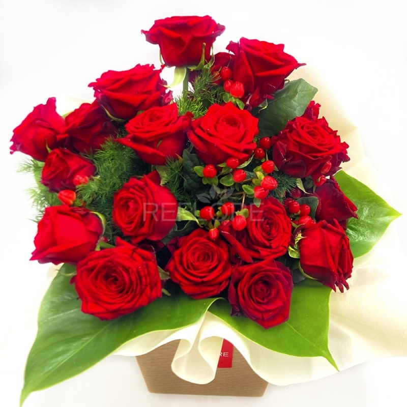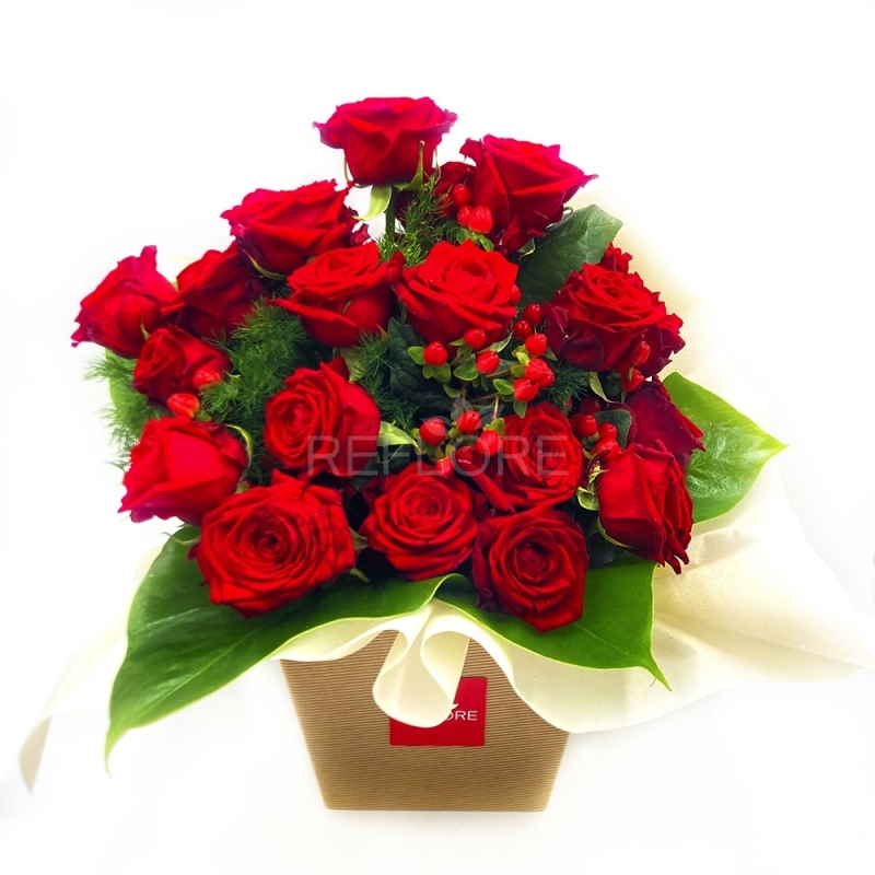 Elegenate e maestoso bouquet fresh confezionato con spledide rose rosse carminio, una valida alternativa al classico bouquet di rose rosse che viene confezionato nella speciale confezione con riserva d'acqua e originale box, un tocco in più per stupire chi riceverà questo prezioso omaggio.