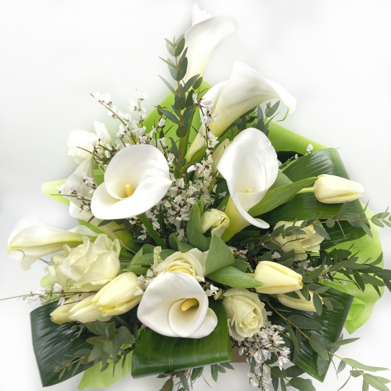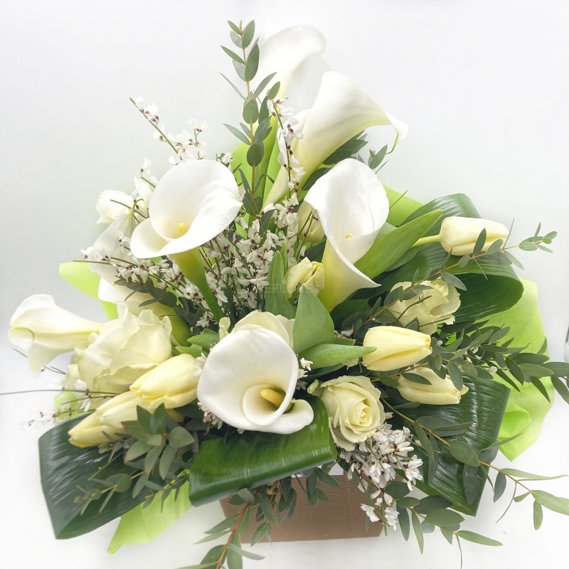 Elegante e prezioso bouquet fresh composto da splendide calle bianche abbinate a fiori di stagione sui toni del bianco. Un regalo raffinato che si adatta a numerose occasioni speciali come matrimoni, nascite, anniversari ma anche compleanni o per dare un tocco di luce alla tua casa.