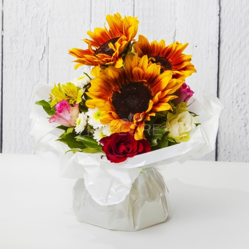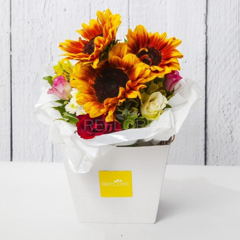 Luminoso bouquet sui toni del giallo e arancio, composto da Girasoli, Rose, San Carlini e verde decorativo.