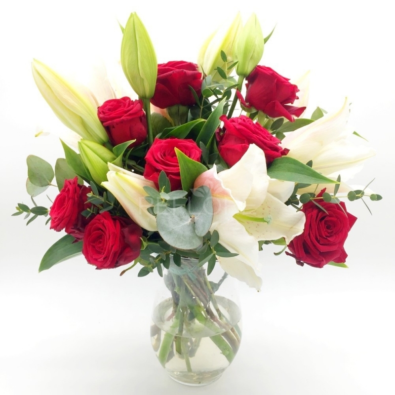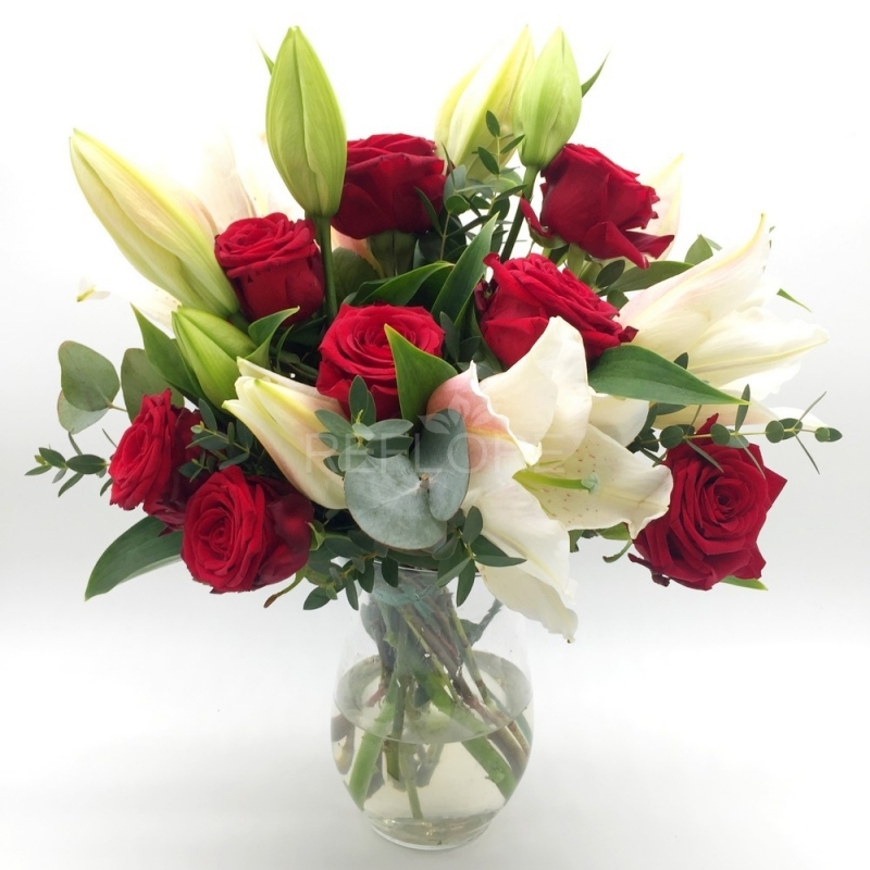 Regala questo raffinato mazzo di fiori e sorprendi una persona speciale con un cocktail di meravigliose rose rosse, simbolo d'amore e di gigli bianchi, sinonimo di purezza e candore. Un'unione speciale per un sicuro effetto a sorpresa che stupirà la persona a cui sono dedicati