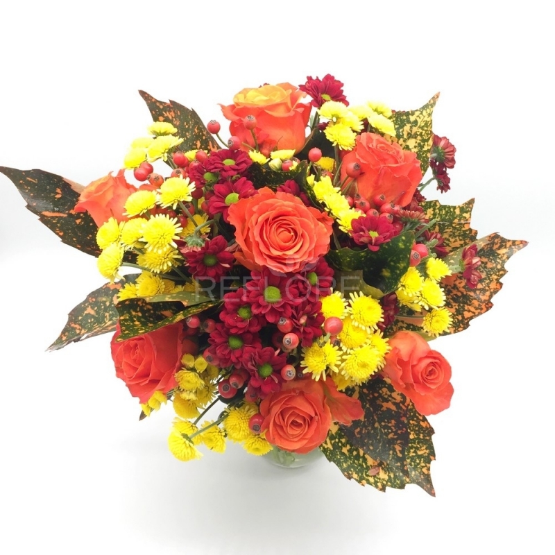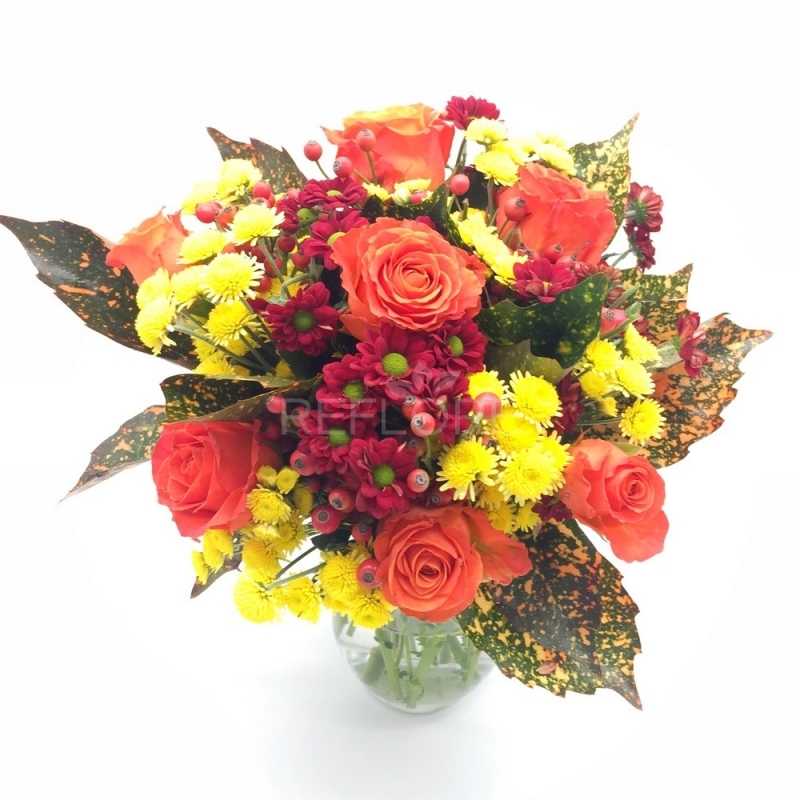 Caldissimo bouquet composto da rose, sancarlini e bacche sui toni del giallo e dell'arancio.