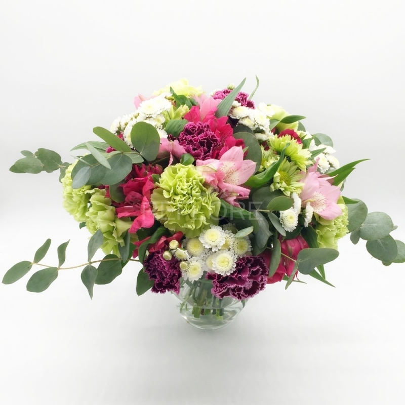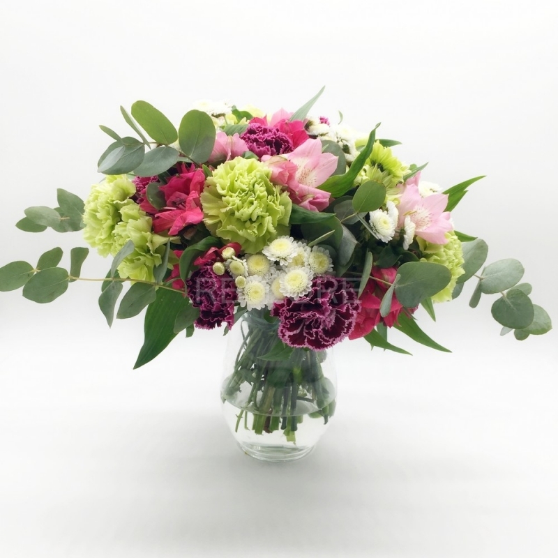 Tenue ma grintoso bouquet composto da morbidi garofani color malva e verdi, alstromelie rosa e come contorno delicate piccole margherite bianche.