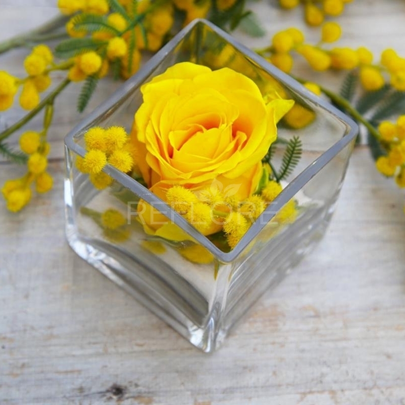 Reflore propone in occasione della Festa della Donna questa rosa stabilizzata gialla con aggiunta di mimosa in un pregevole cubo di vetro.
