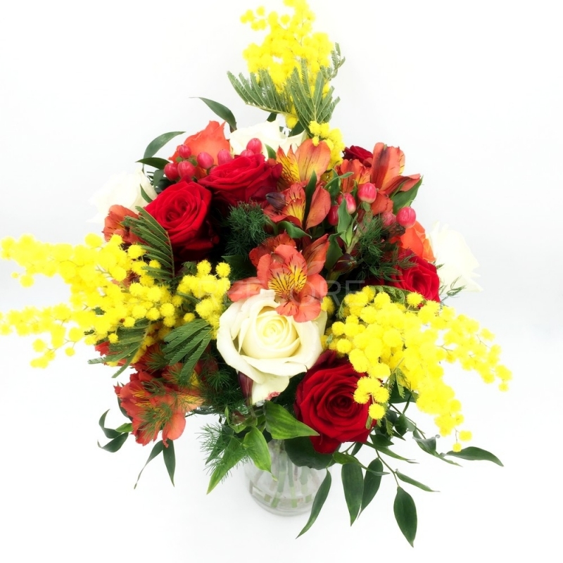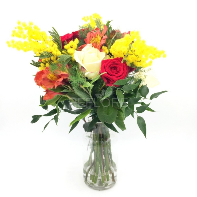 La mimosa, fiore profumato e tenace ben si combina con le rose colorate e fiori di stagione per donare al bouquet un tocco di allegria e vivacità. Un mazzo di fiori ideale per festeggiare la Festa della Donna, è perfetta per fare i tuoi auguri ad una donna che occupa un posto speciale nella tua vita: tua moglie, la tua compagna, mamma, amica o sorella.