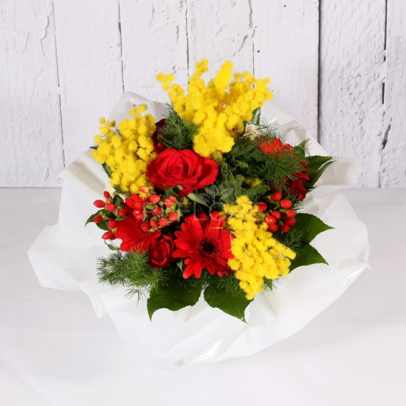 Splendido e profumato bouquet sui toni del rosso e giallo composto da rose, gerbere e coloratissima mimosa.