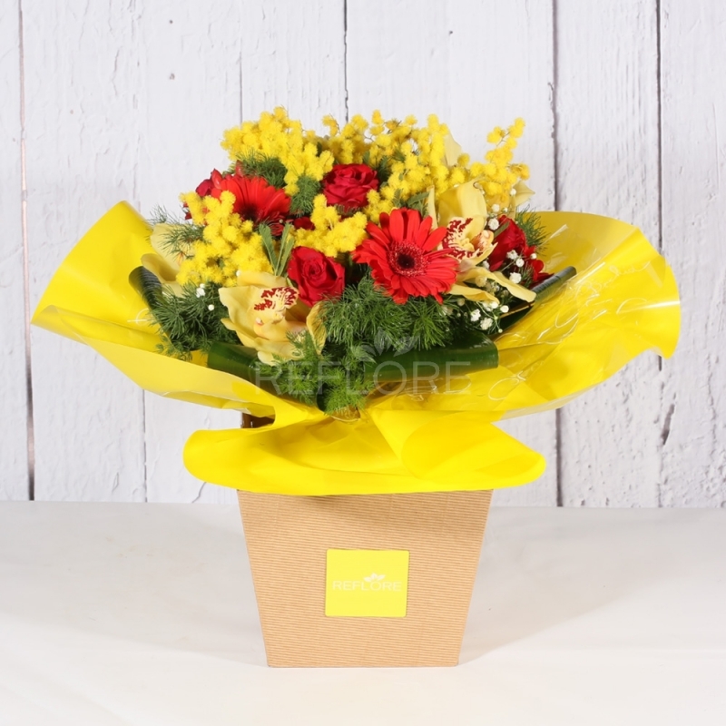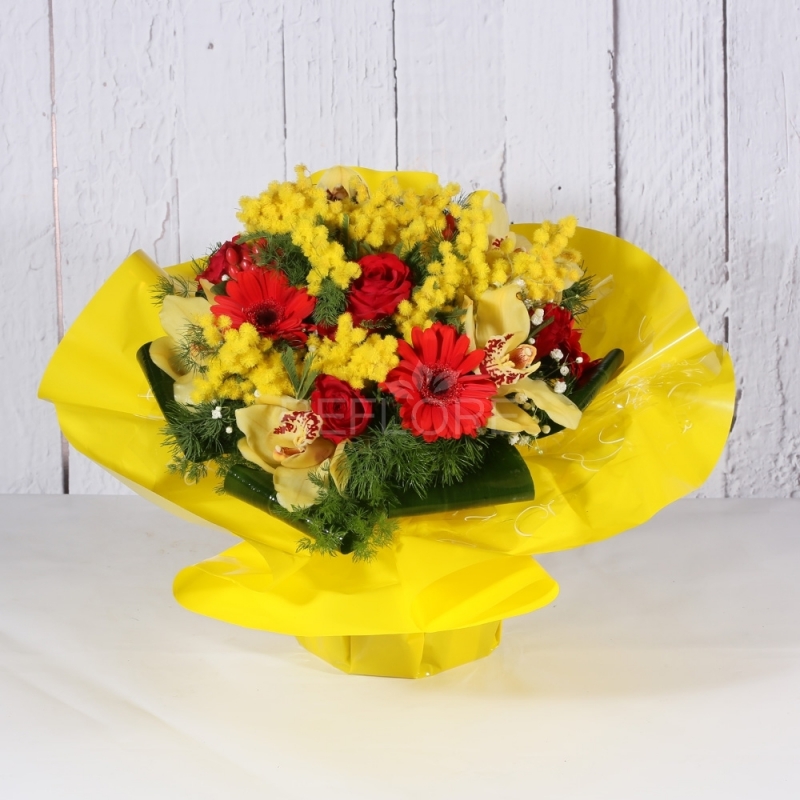Splendido bouquet sui toni del giallo e rosso composto da Rose, Orchidee e Mimosa.