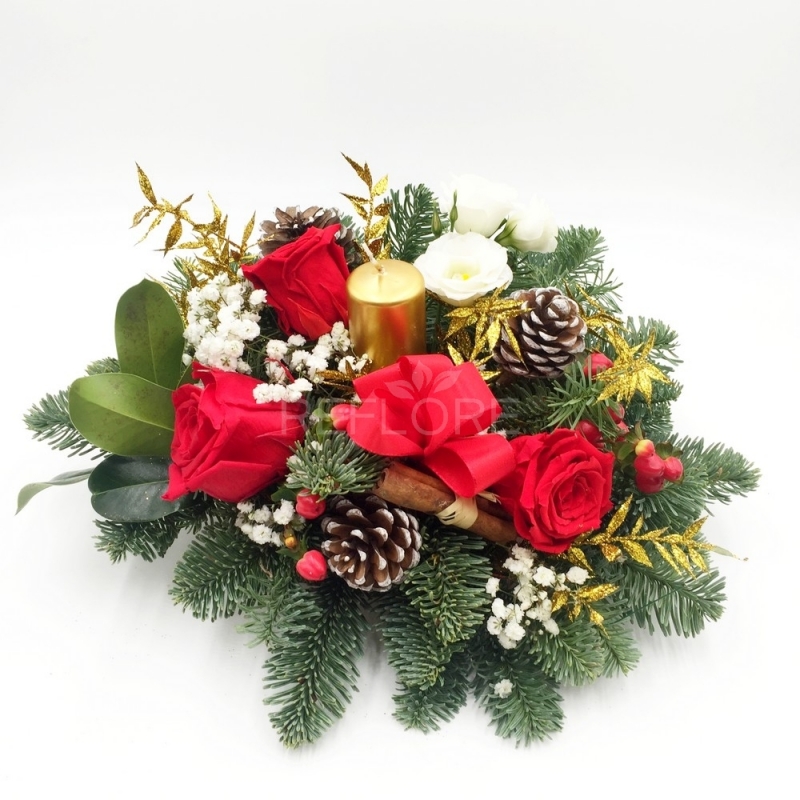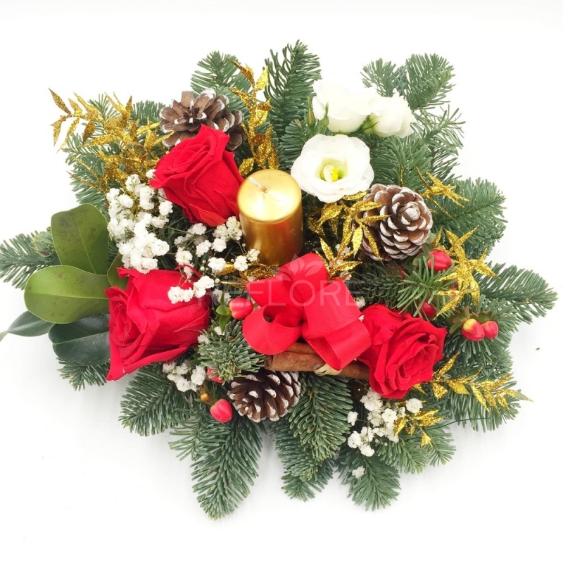 Elegante centrotavola natalizio con rose rosse, bacche di iperico, pigne, pino e candela il tutto arricchito che dettagli preziosi. Ideale per rendere scintillanti tutte le case in questi giorni di festa e per dare un tocco di magia alla tua tavola di Natale.