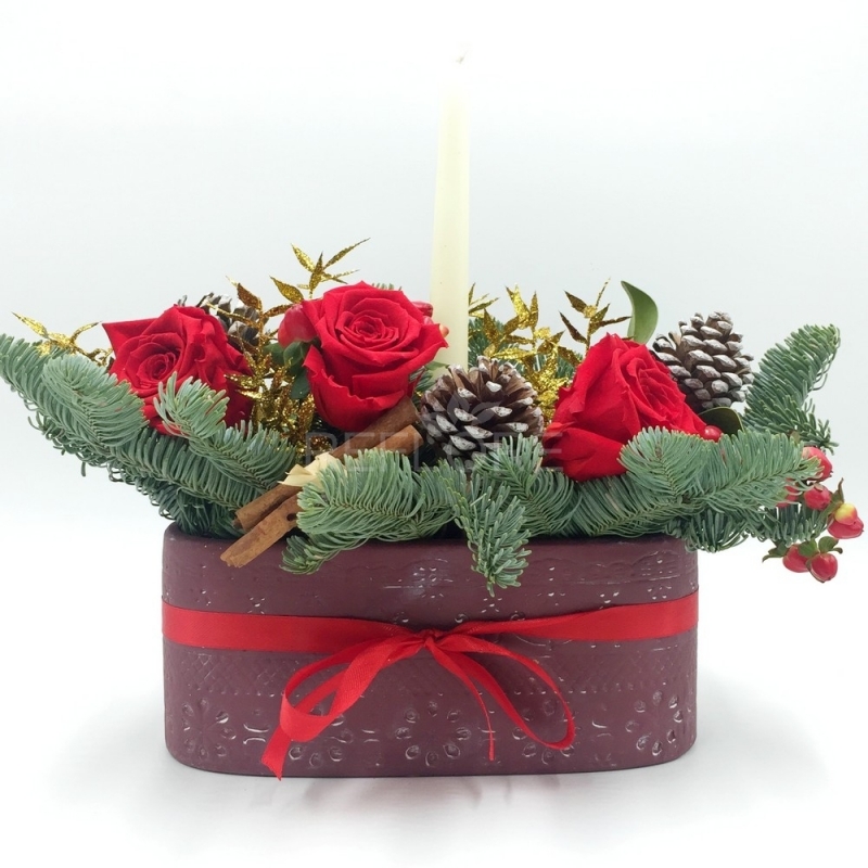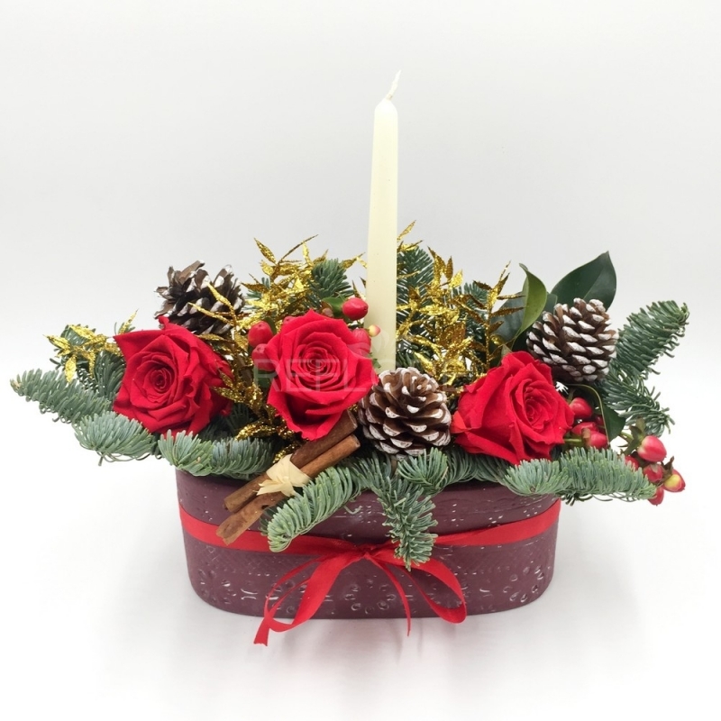 Elegante e raffinato centrotavola natalizio con base in ceramica, rose rosse, bacche di iperico, pigne, pino e candela il tutto arricchito che dettagli preziosi. Un regalo di sicuro effetto per condividere insieme la magia del Natale.