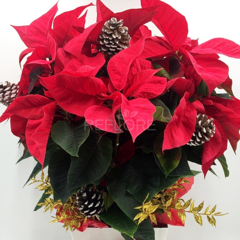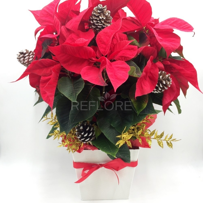 Splendida e scintillante stella di Natale elegantemente confezionata e arricchita da preziosi dettagli natalizi quali le pigne, il pungitopo o altri decori luminosi. La classica stella cosi allestita renderà ancora più belle le case di chi la riceverà in questi giorni di festa.
