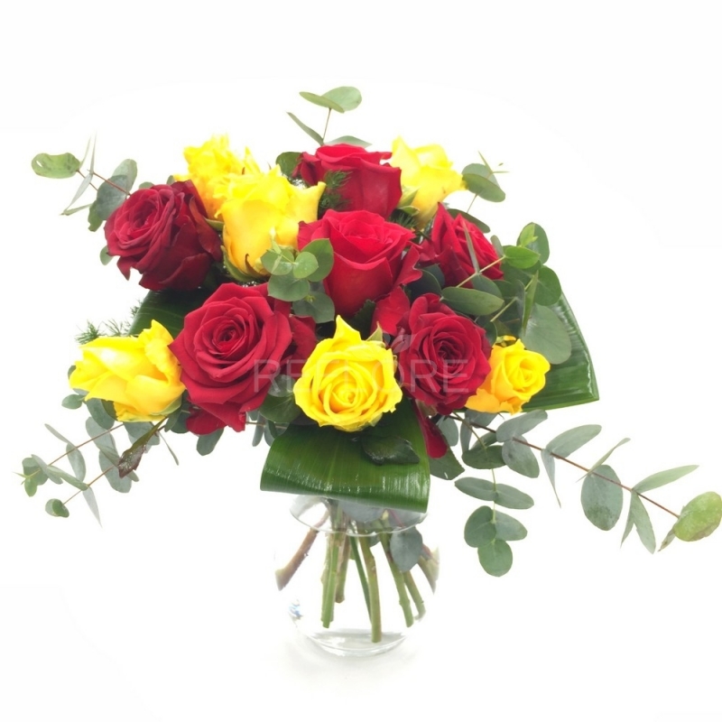 Bouquet composto da 13 rose rosse e 12 tulipani gialli confezionati con verde decorativo.
