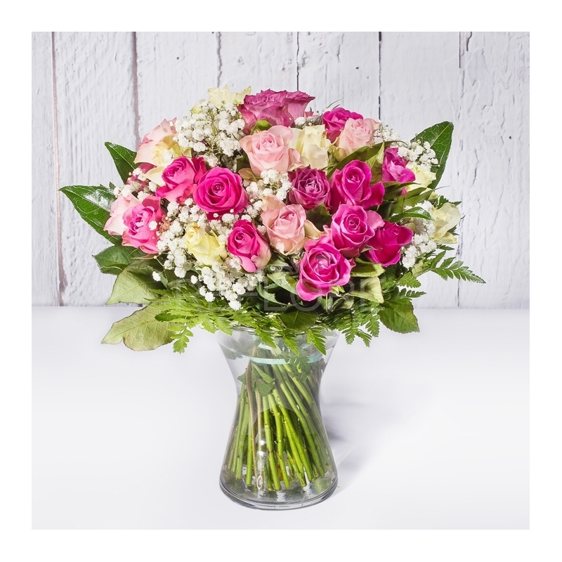 Una mazzo di piccole rose dal gusto fine e delicato che unisce due colori tenui, ideale per un compleanno, una nascita ma anche per un compleanno o un augurio ad una persona a cui vogliamo bene. Le rose sono sempre gradite per il loro profumo, la loro durata e sono un classico senza tempo.